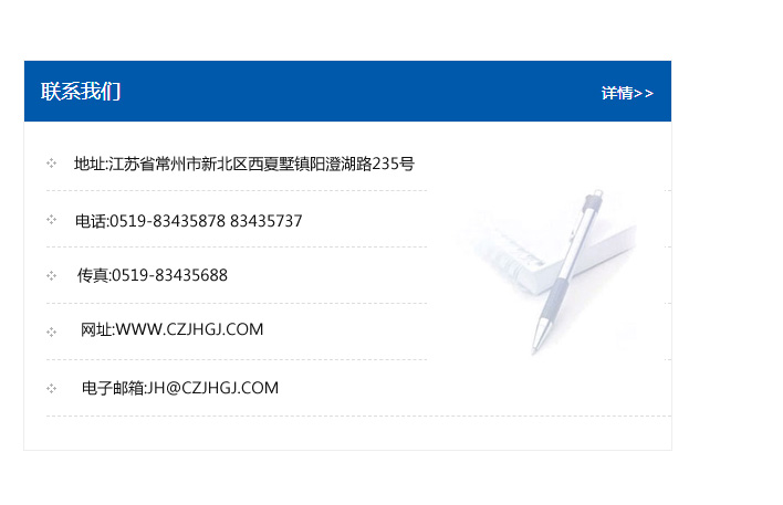 地址:常州市新北區友邦商務大廈1幢16、17層  電話:0519-85101652  傳真:0519-85112595  郵編:213022  網址:www.cz-jiayue_cn.jinyuantj.com  郵箱:xiajifengaa@163.com
